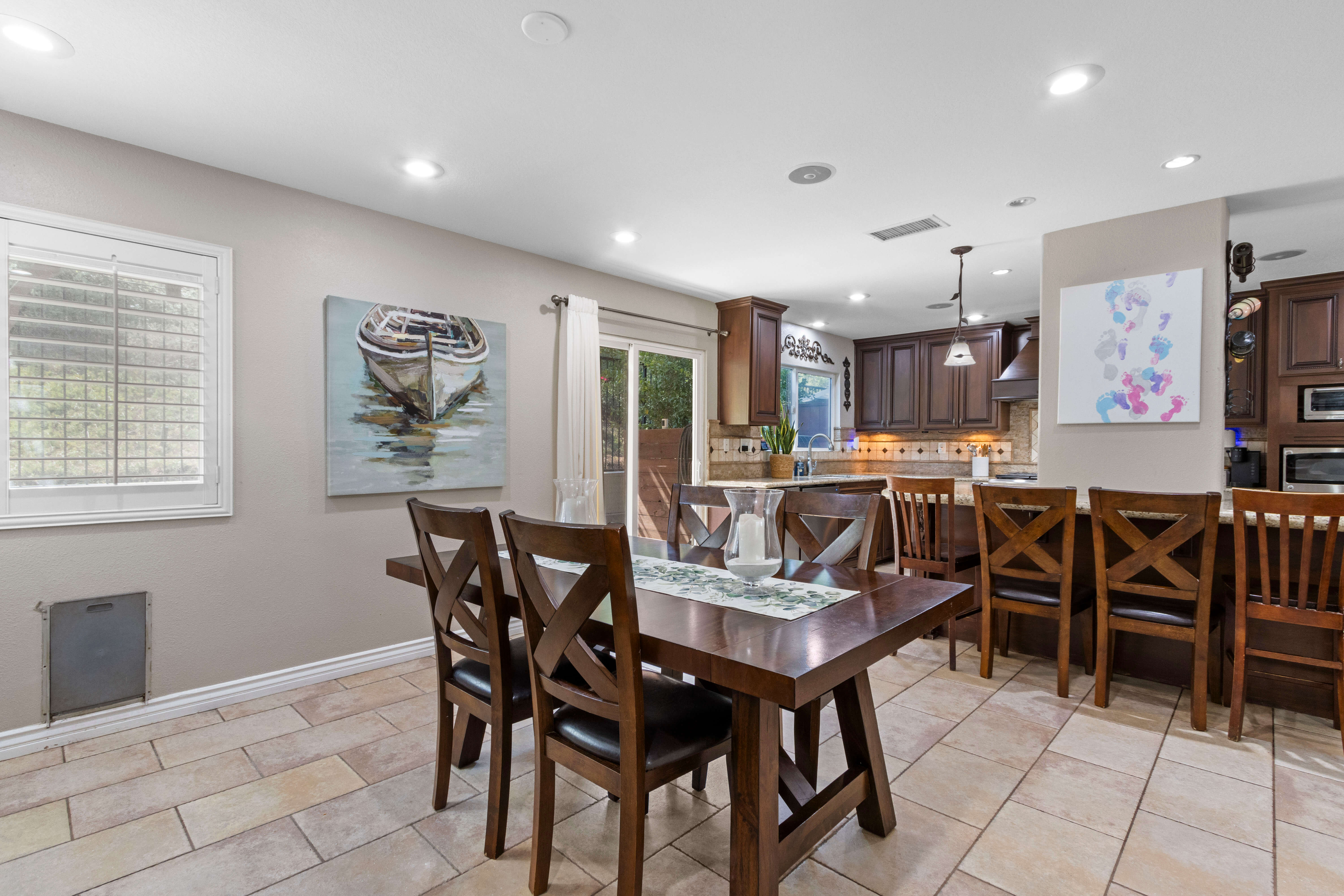 This 3-bedroom, 2.5-bath home features a bright, open floor plan with fresh interior and exterior paint, porcelain tile flooring downstairs, and a cozy wood-burning fireplace with gas hookup. The remodeled gourmet kitchen boasts granite countertops, custom cabinetry, travertine backsplash, a massive 48” 6-burner professional range with griddle, large center island with built-in beverage fridge, and newer dishwasher and disposal. Upstairs includes engineered wood flooring throughout, a spacious loft/bonus room perfect for an office or second living area, and updated bathrooms—including a hall bath with dual sinks. All bedrooms feature ceiling fans, and the home is equipped with fiber optic internet, a whole-house fan, and a recently serviced 4.5-ton two-stage A/C system. Step outside to your private backyard oasis with stamped concrete, built-in BBQ island, and a fire pit—ideal for entertaining. Dual-pane windows and sliding doors offer energy efficiency, and rain gutters add low-maintenance convenience. Located just a short walk to Butterfield Ranch Elementary, nearby parks, and a city-sponsored preschool. Minutes to Los Serranos Country Club, shopping, and major freeways for easy commuting to Orange County, LA, and the Inland Empire.